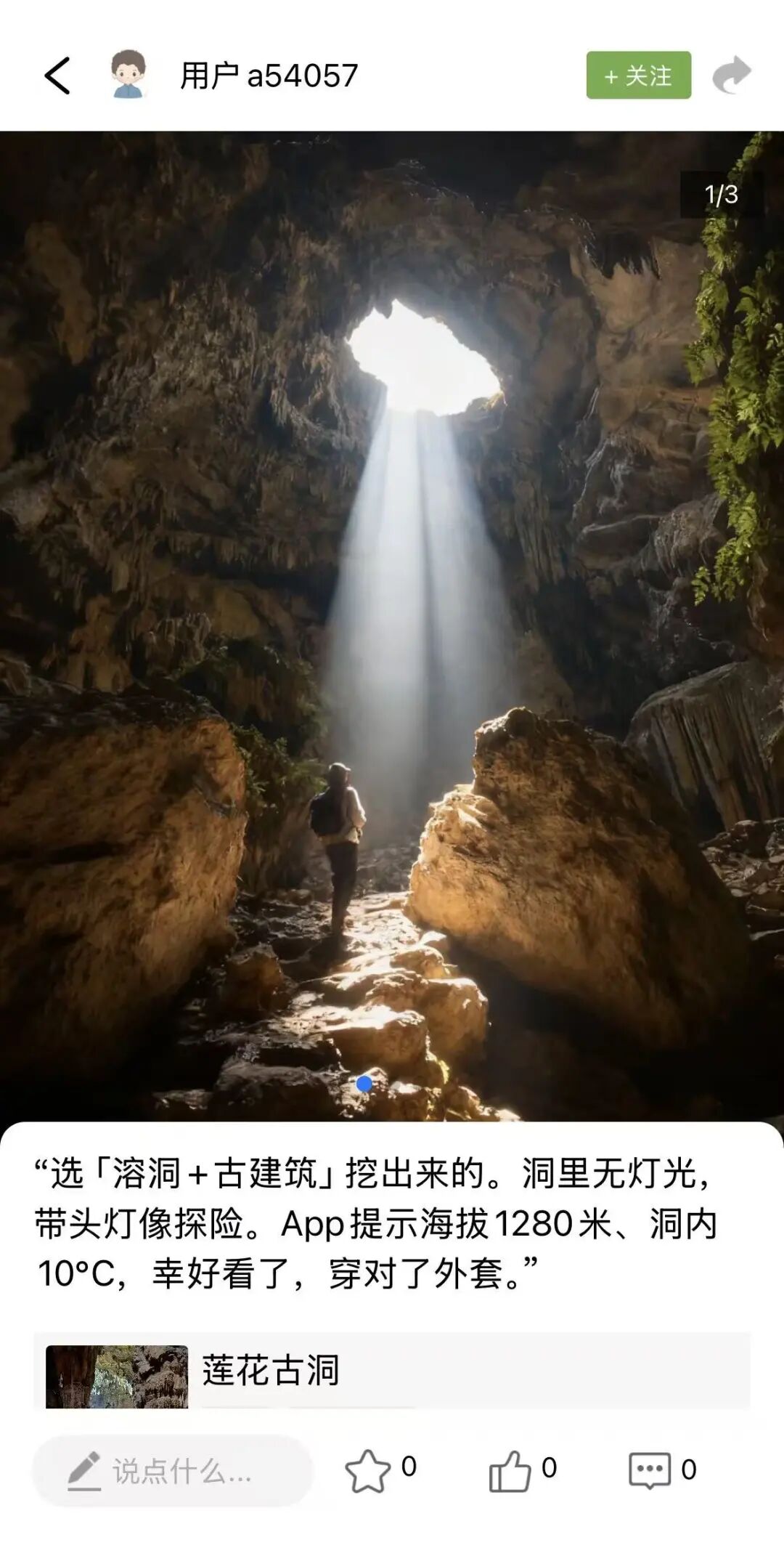玩法:溶洞|古建筑用户说:“选「溶洞+古建筑」挖出来的。洞里无灯光,带头灯像探险。App提示海拔1280米、洞内10℃,幸好看了,穿对了外套。”