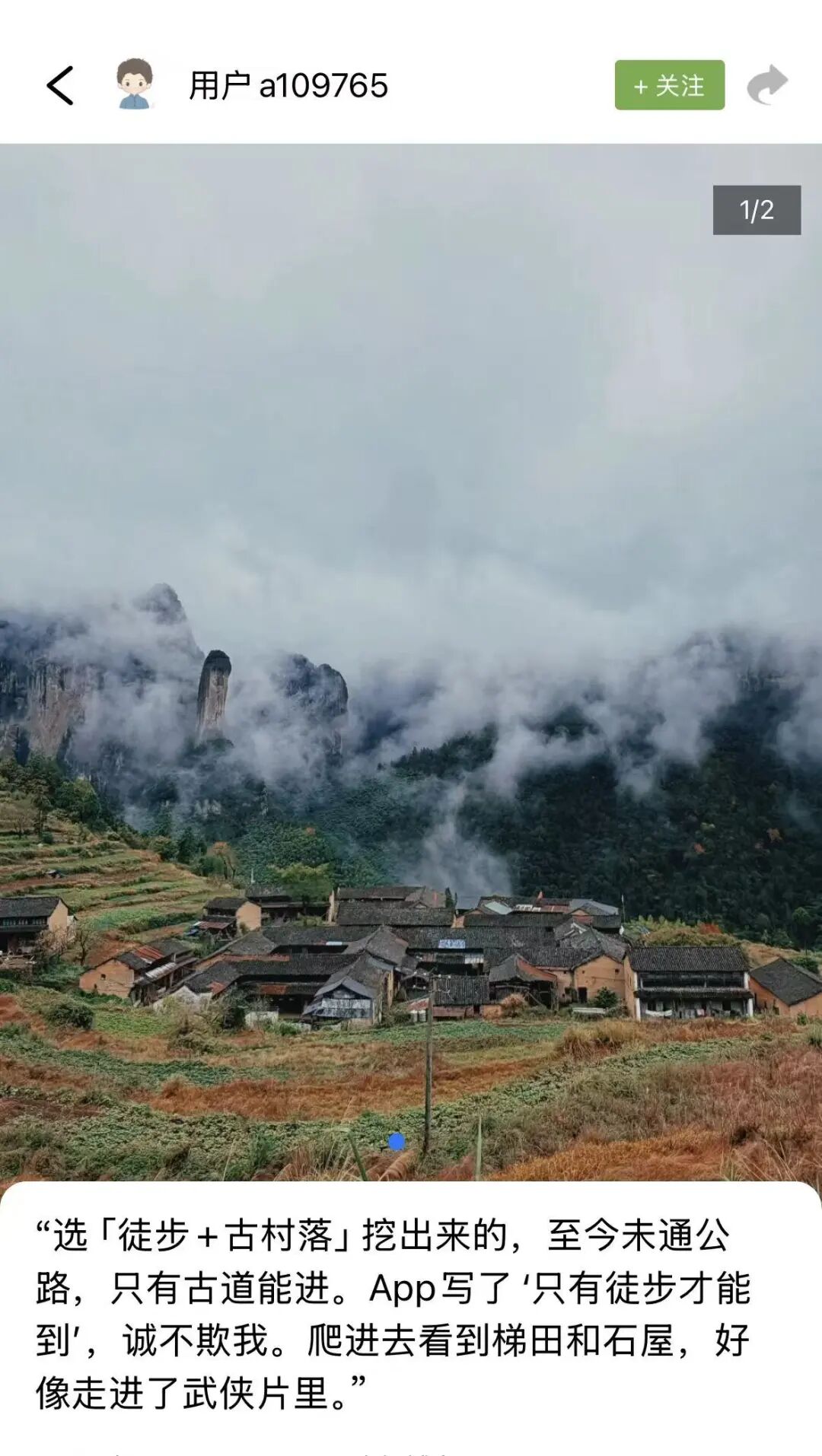 玩法:徒步|古村落用户说:“选「徒步+古村落」挖出来的,至今未通公路,只有古道能进。App写了‘只有徒步才能到’,诚不欺我。爬进去看到梯田和石屋,好像走进了武侠片里。”