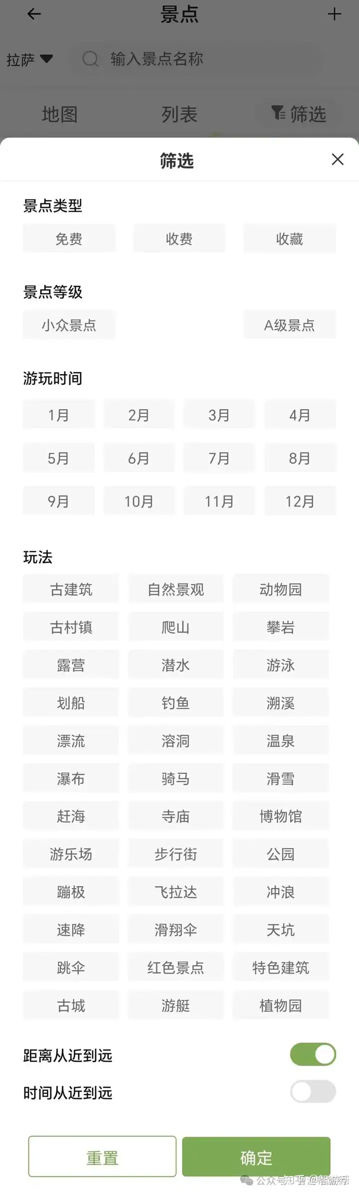 点击右上角的「筛选」按钮,智游帮的“智能漏斗”开始工作。这里没有复杂的参数,只有直观的“类型”和“玩法”。按照你的需求设置,点击“确定”,地图上不符合要求的景点瞬间隐藏,只剩下与你的兴趣完美匹配的目的地。从“海选”到“精选”,决策过程被缩短到一次点击的时间。