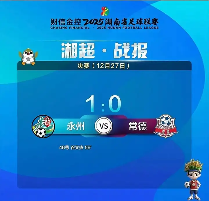 比赛上半场双方0:0战平,下半场第58分钟,永州队获得角球机会,谷文杰在门前混战中头球破门,打破僵局。