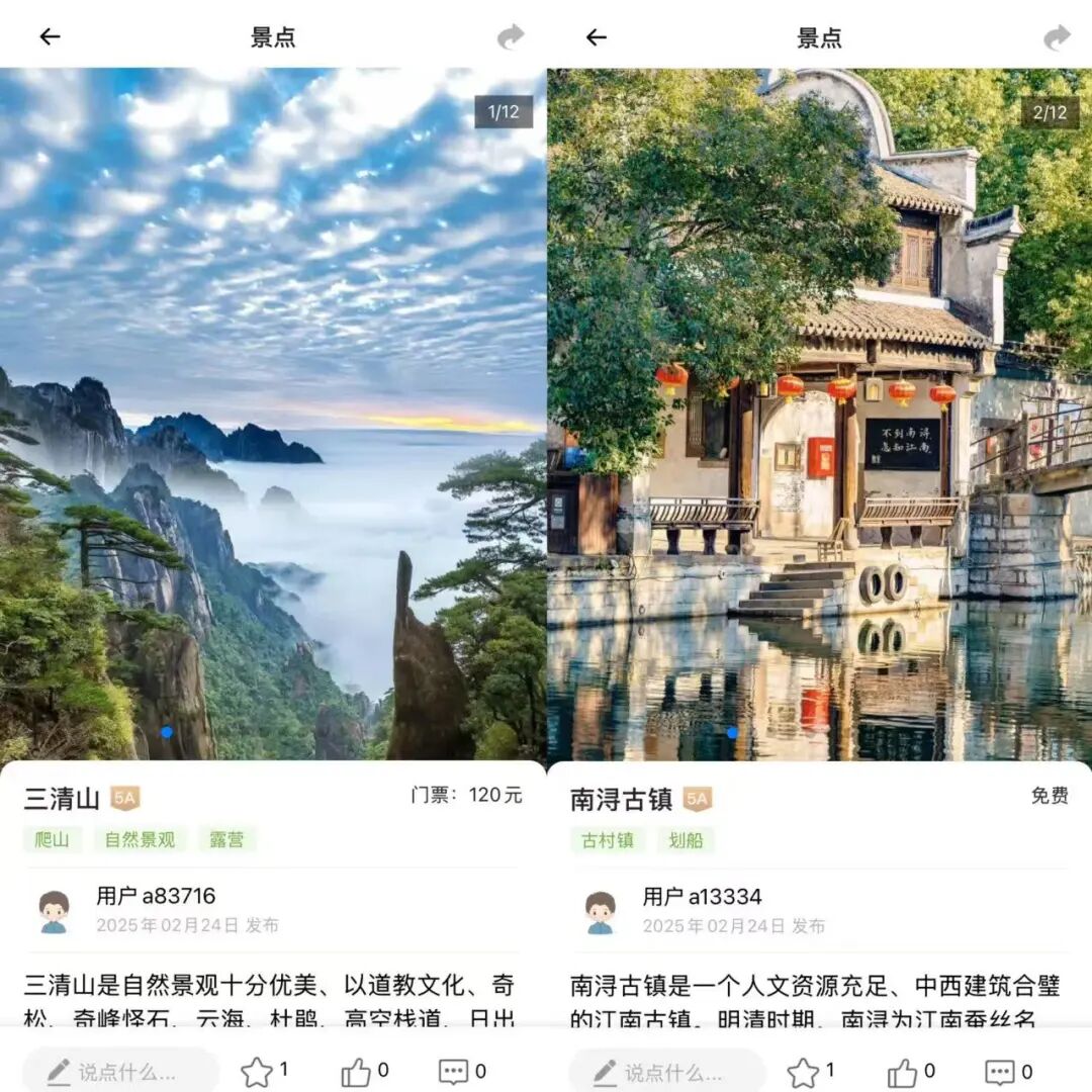 第四步:用「智游帮」快速锁定Plan B如果决定转战国内,打开「智游帮」App,点击首页「景点」功能,勾选「自然风光」+「小众秘境」,瞬间就能找到一批避开人潮的宝藏地——比如江西三清山(奇峰怪石堪比黄山)、浙江南浔古镇(江南水乡里的“活化石”)……每个景点都附带详细攻略、交通方案和周边住宿推荐,10分钟就能搞定新行程。